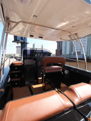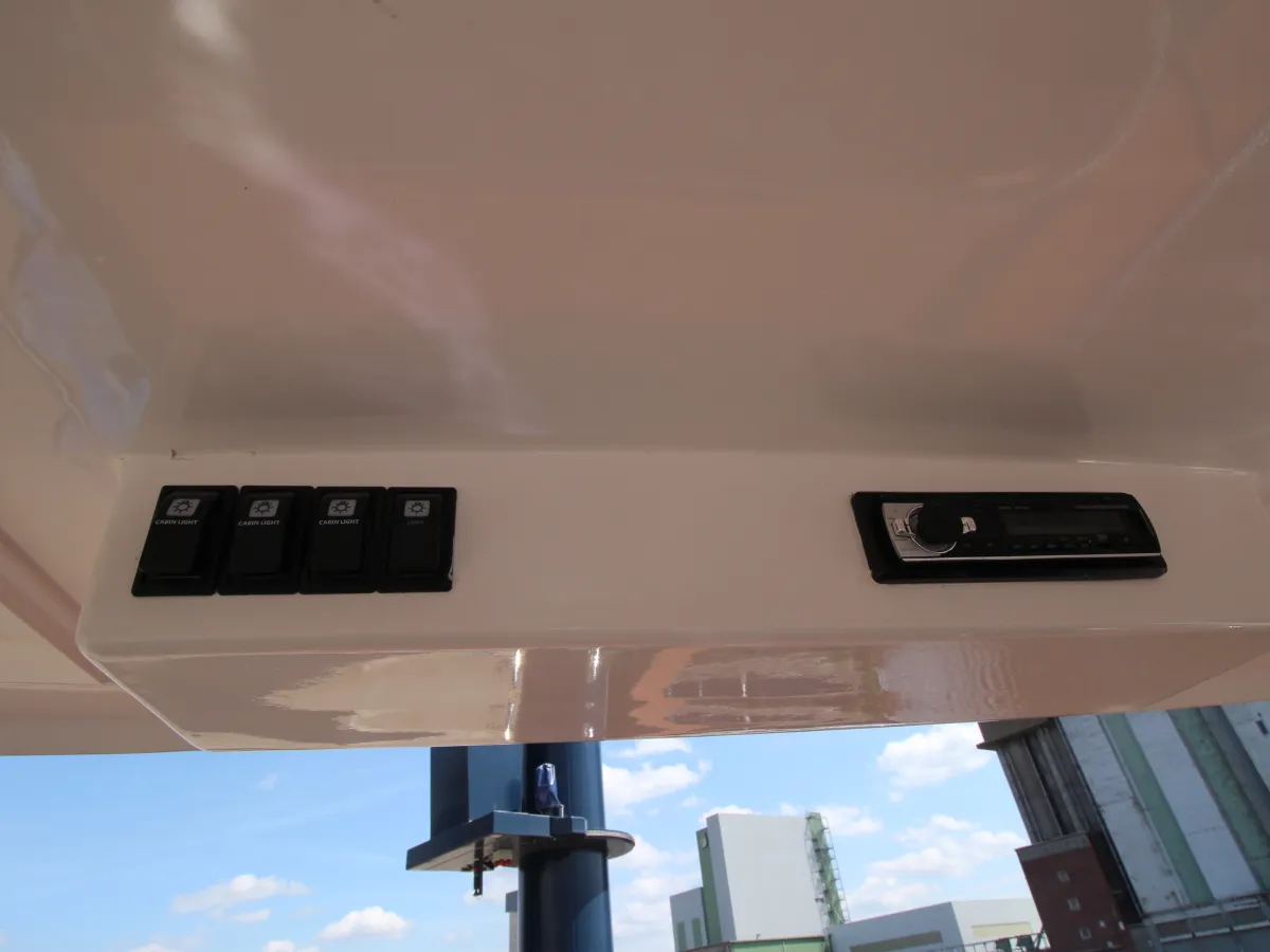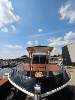 Das Exterieur des Bootes ist sowohl funktional als auch optisch ansprechend gestaltet. Das Boot verfügt über ein Teakdeck, das für eine luxuriöse Optik und guten Halt sorgt. Das Hardtop aus hochglanzpoliertem Edelstahl ist mit Beleuchtung, eingebauten Lautsprechern und einem Bluetooth-Radio ausgestattet. Dies ermöglicht es, während der Fahrt oder beim Entspannen auf dem Wasser Musik zu genießen.