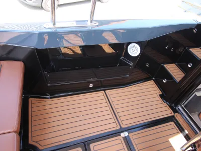 An der Vorderseite befindet sich ein großes Sonnenbett, das über feste Treppen mit integrierter LED-Beleuchtung leicht zugänglich ist. Das Cockpit verfügt über eine feste Sitzbank und eine ergonomische Steuerkonsole. Für zusätzlichen Komfort gibt es eine elektrische Ankerwinde mit einem Edelstahlanker und Kette. Das Boot ist außerdem mit einer Schwimmplattform und Badeleiter ausgestattet, was das Ein- und Aussteigen ins Wasser erleichtert.