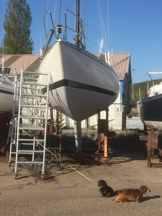 It was last out of the water in 2023 for maintenance, including an antifouling treatment. There are no signs of osmosis, and the boat is internationally registered with a pleasure craft certificate.