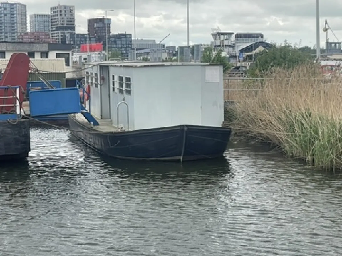 A former shop ship that has been moored in a marina. The ship has been used commercially up to now. This can range from a former shop ship, maintenance work, support of harbor activities to other forms of maritime services. The boat is not registered, and it is a commercial ship for which VAT must be paid upon purchase.