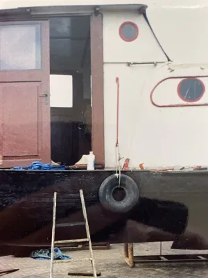 De buitenkant van de boot is robuust, met een lengte van 12 meter en een breedte van 2,50 meter, waardoor de boot een aanwezigheid op het water is. Het staal van de romp is aangetast door de tand des tijds en komt in aanmerking voor onderhoud.